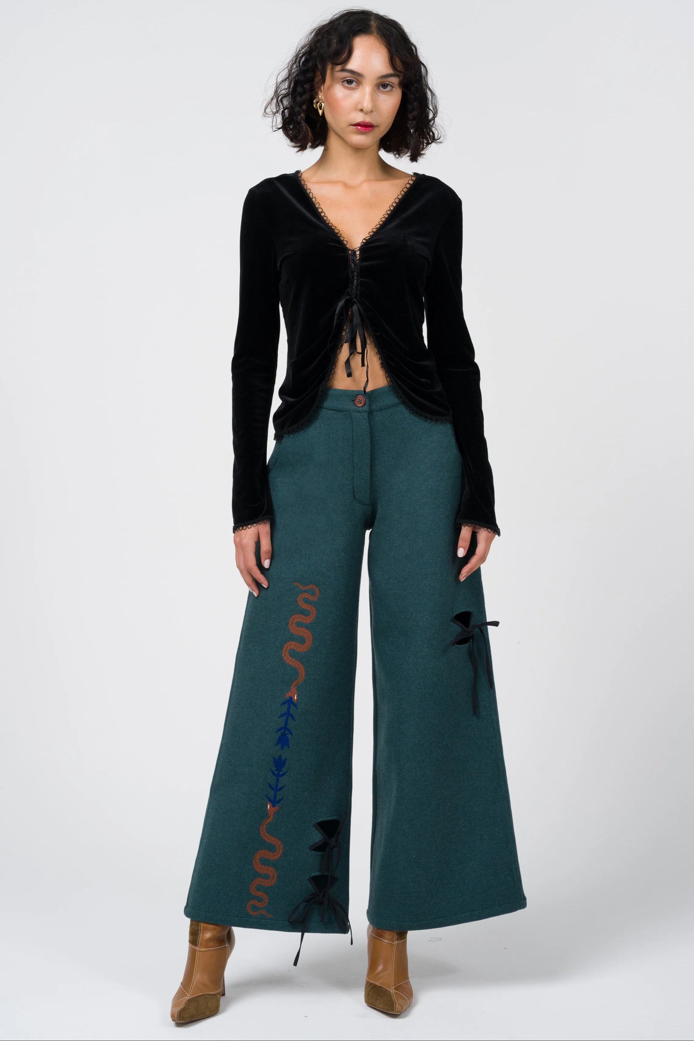The Metamorphosis Trousers are made of Italian, recycled wool and feature an embroidered detail of a serpent and flower