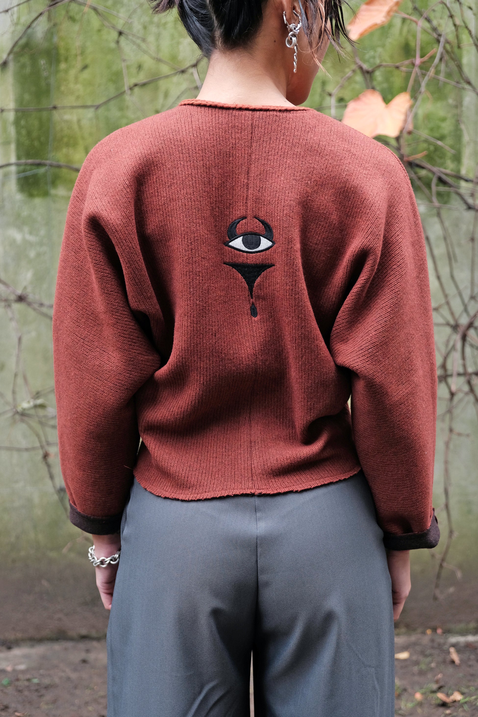 The Evil Eye Jumper features a bat wing sleeve and a crochet-knit collar around the neck and chest. The imagery evoked by the embroidery is that of the powerful 'evil eye', a reimagined talisman to bring you luck and protection.Â