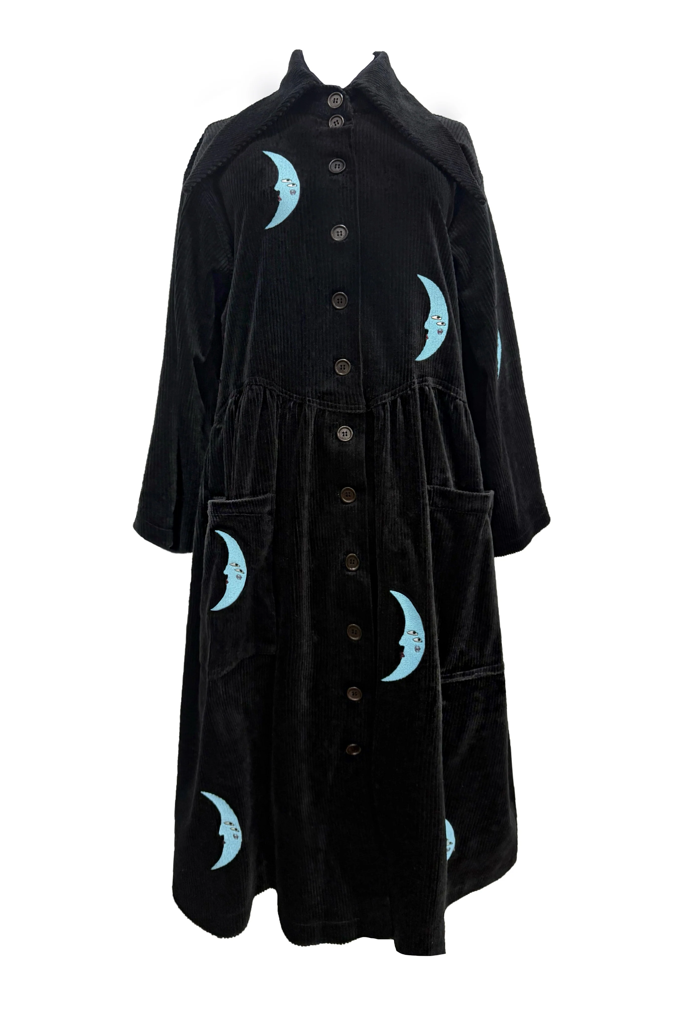 The Persephone Coat is a truly magical piece of outerwear, crafted from black cotton cord and designed with an oversized silhouette, dramatic lapels, and generous pockets. Dark green scorpion embroidery adds an element of symbolism and artistry, with each coat taking around six hours to embroider.