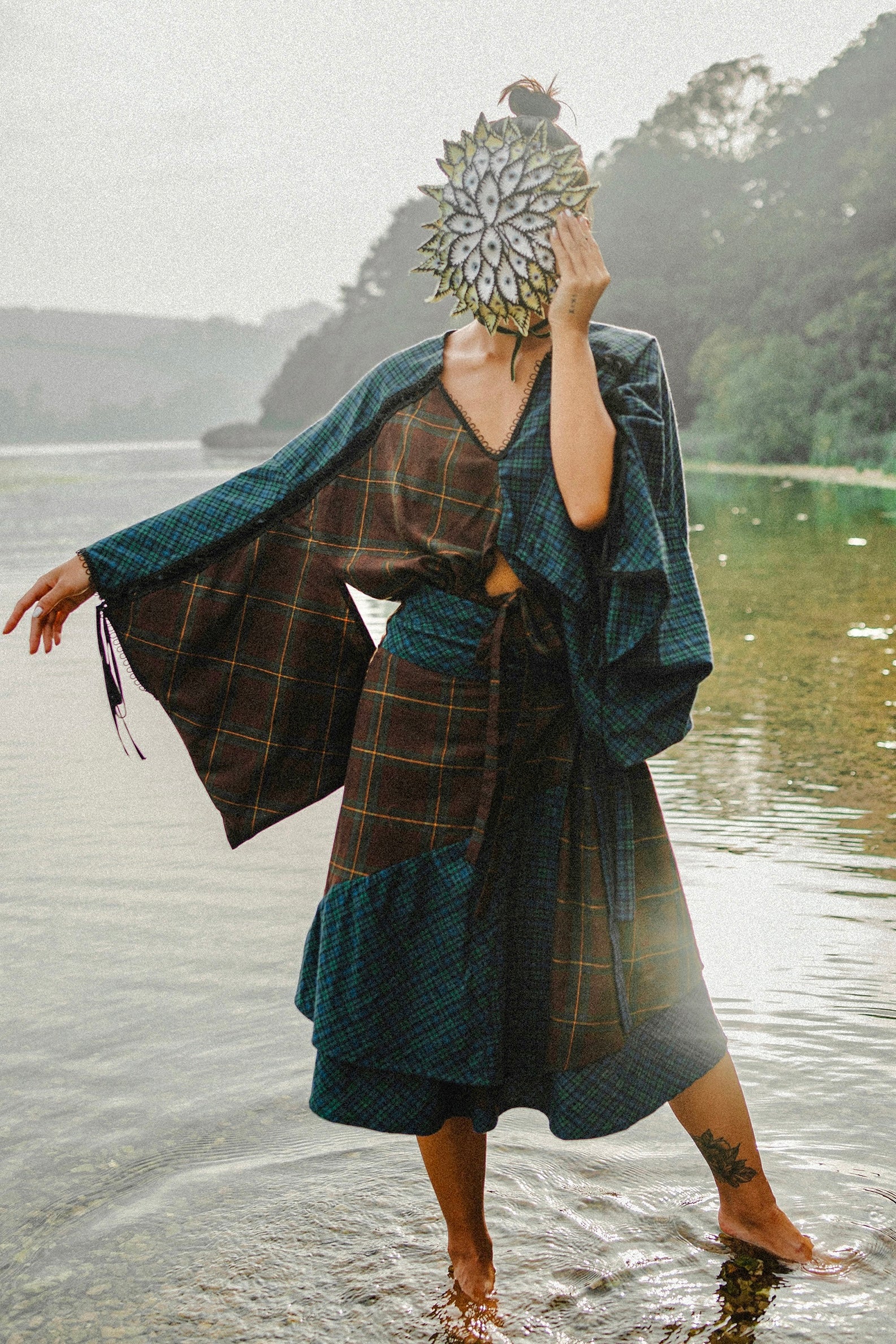The Tartan Fusion Dress is designed to make an impression, combining contrasting tartan fabrics in earthy brown and deep sea blue green tones. The patchworked composition creates movement and texture, bringing together structure and softness in a single silhouette.